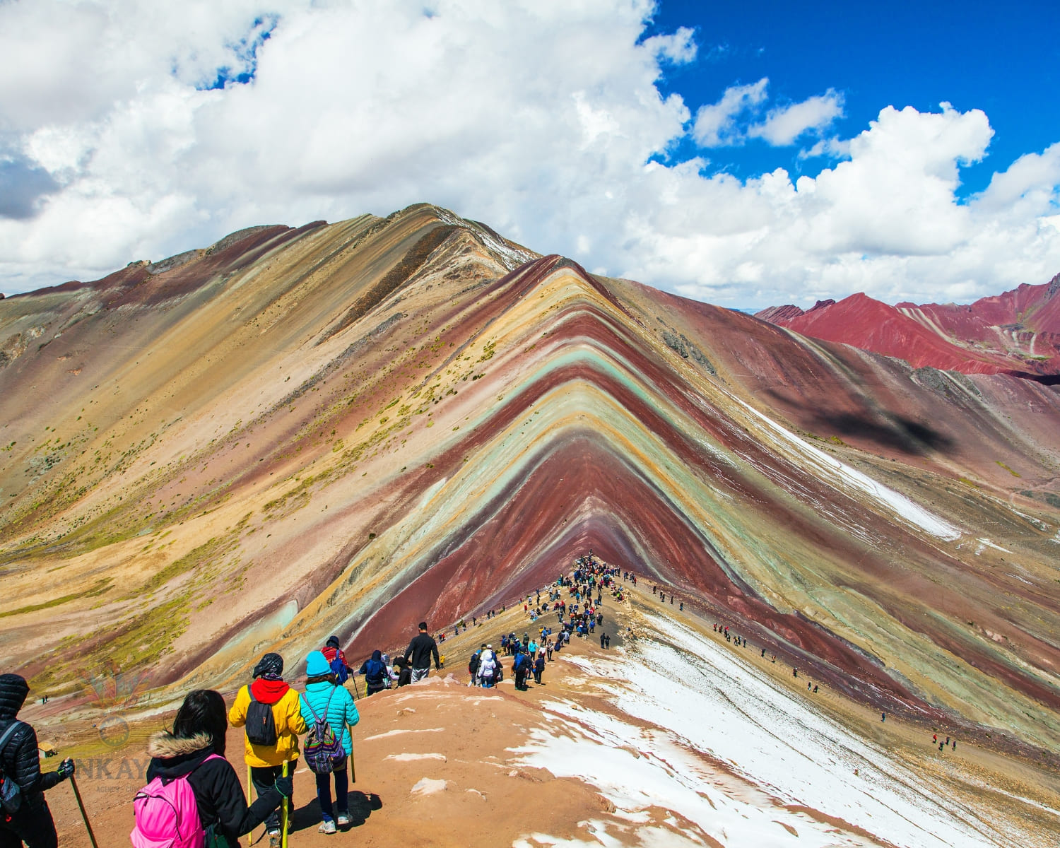Al llegar a la cumbre de Vinicunca, ubicada a más de 5,000 m s. n. m., podrás contemplar una de las formaciones montañosas más únicas del planeta. Las franjas de colores naturales –producto de la sedimentación mineral– convierten este lugar en una postal inolvidable.